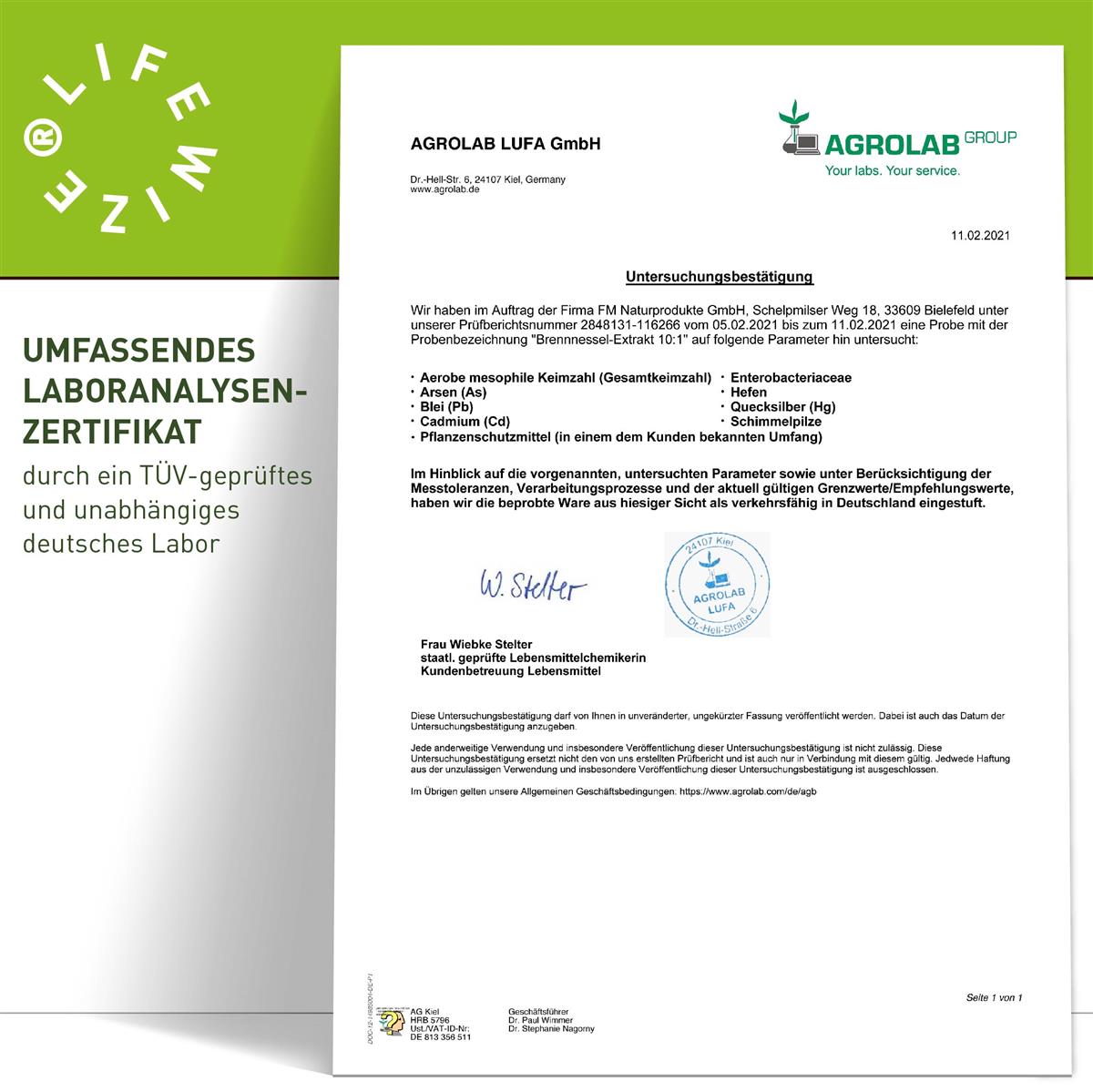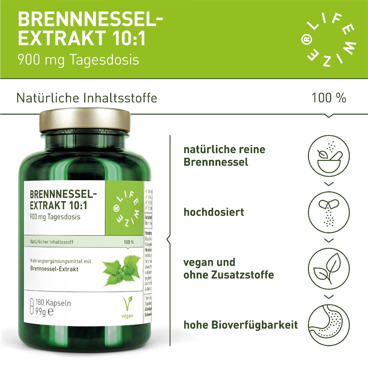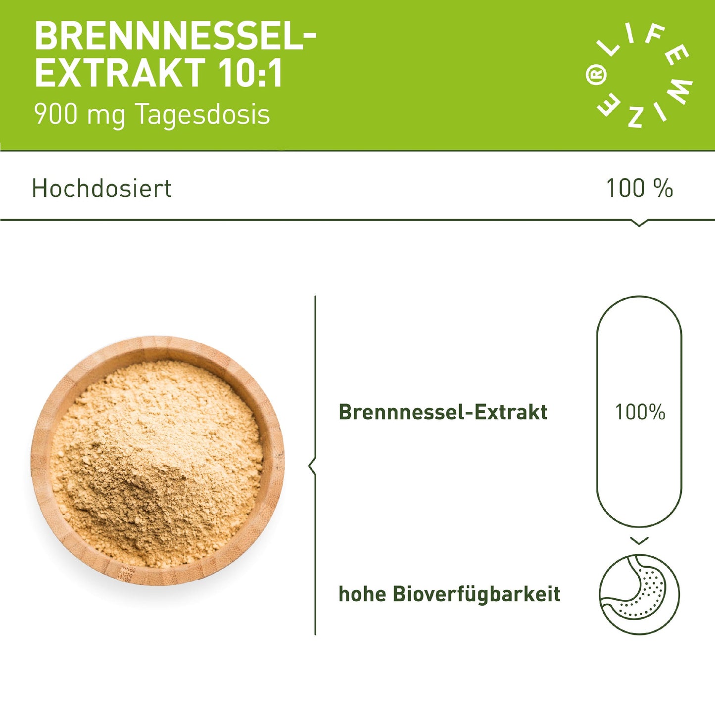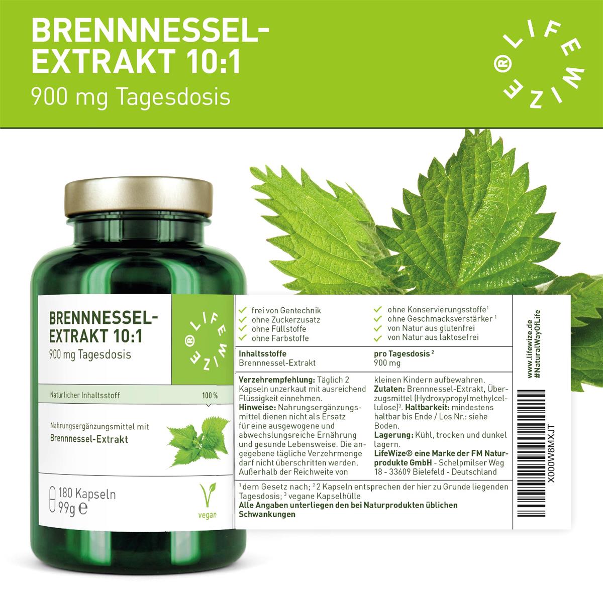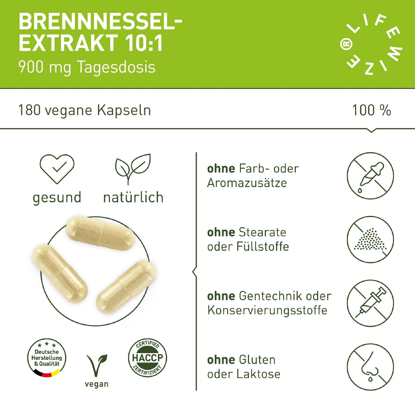 Die LifeWize® Brennnessel Kapseln mit Brennnessel-Extrakt sind ein Nahrungsergänzungsmittel, das sich durch höchste Bioverfügbarkeit für den Körper auszeichnet. Dieses Produkt wird in Deutschland unter Einhaltung höchster Qualitätsstandards- und Hygienerichtlinien produziert. Labor geprüft und frei von jeglichen Zusätzen.