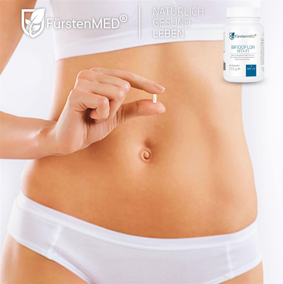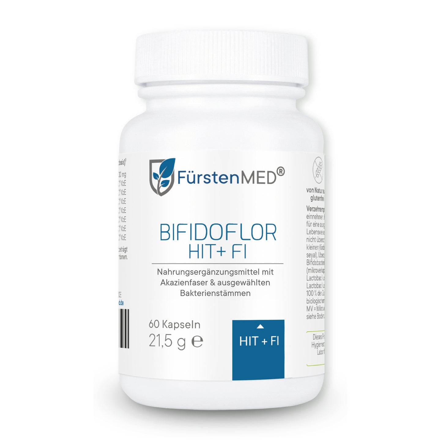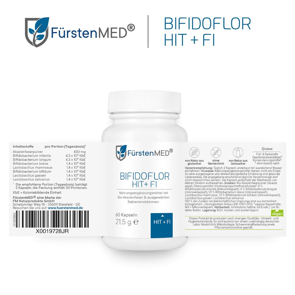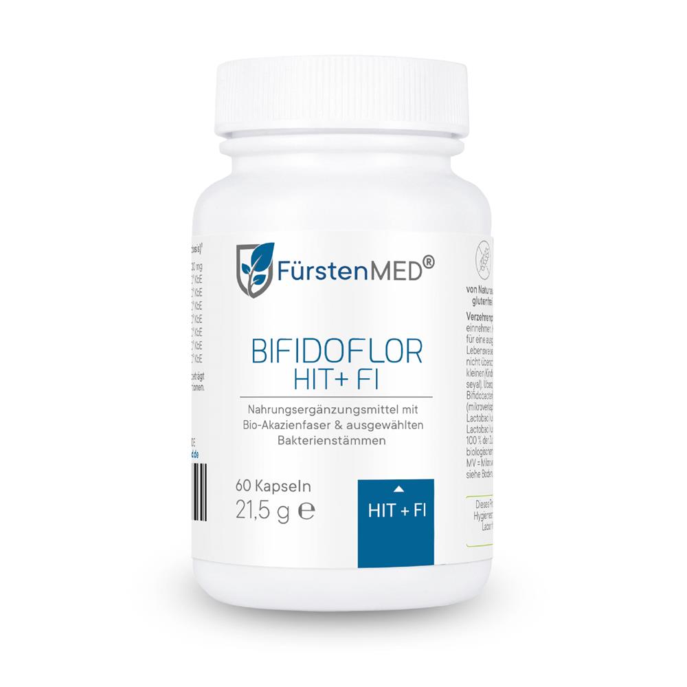 Die FürstenMED® Bifidoflor HIT + FI Kapseln sind ein Nahrungsergänzungsmittel mit ausgewählten Bakterienkulturen der Stämme Lactobacillus und Bifidobacterium in Kombination mit Akazienfaserpulver. Dieses Produkt ist in Deutschland entwickelt und unter Einhaltung höchster Qualitätsstandards- und Hygienerichtlinien produziert.