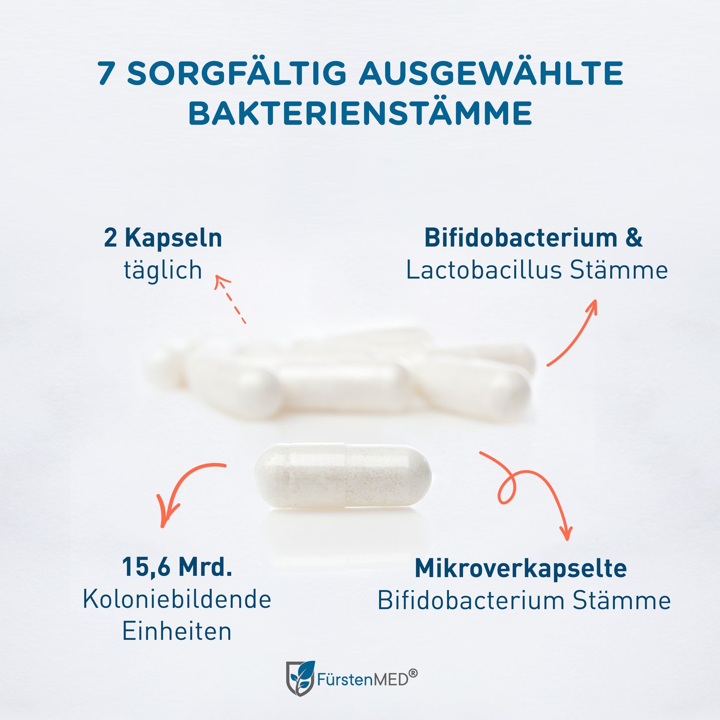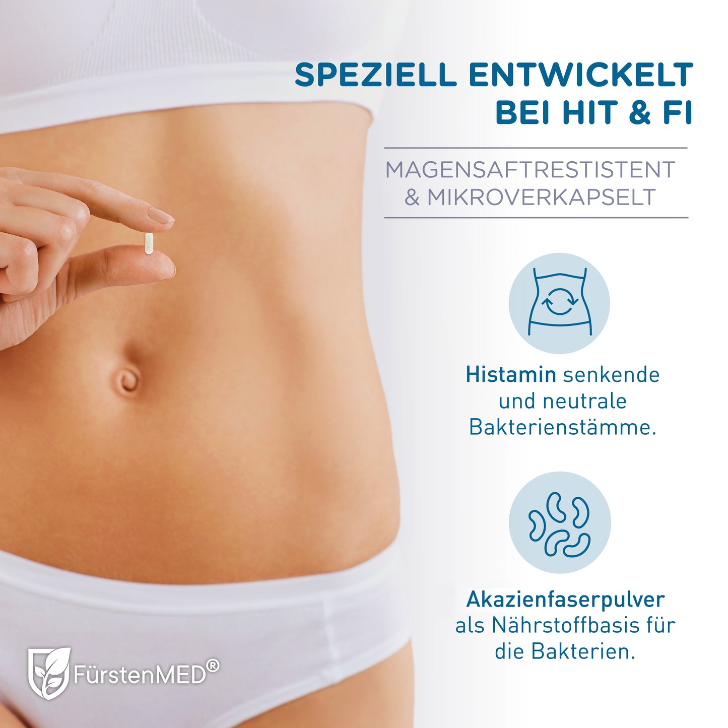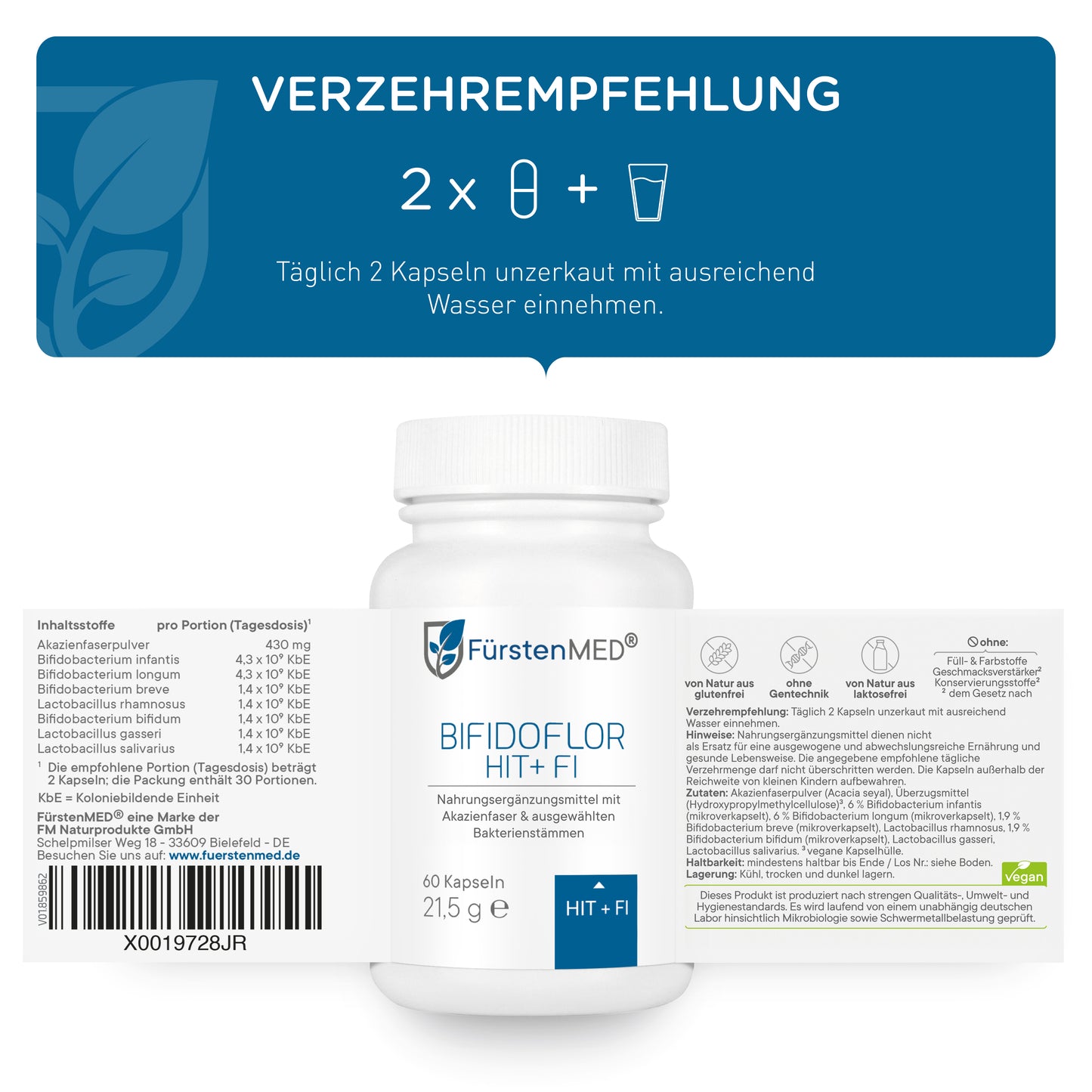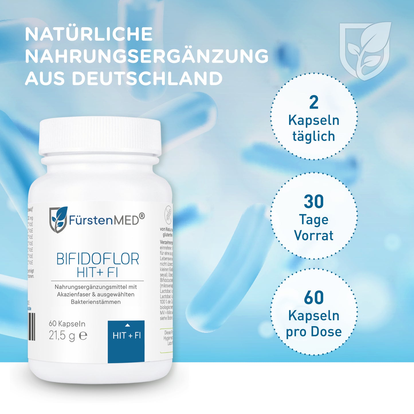 Die FürstenMED® Bifidoflor HIT + FI Kapseln sind ein Nahrungsergänzungsmittel mit ausgewählten Bakterienkulturen der Stämme Lactobacillus und Bifidobacterium in Kombination mit Akazienfaserpulver. Dieses Produkt ist in Deutschland entwickelt und unter Einhaltung höchster Qualitätsstandards- und Hygienerichtlinien produziert.