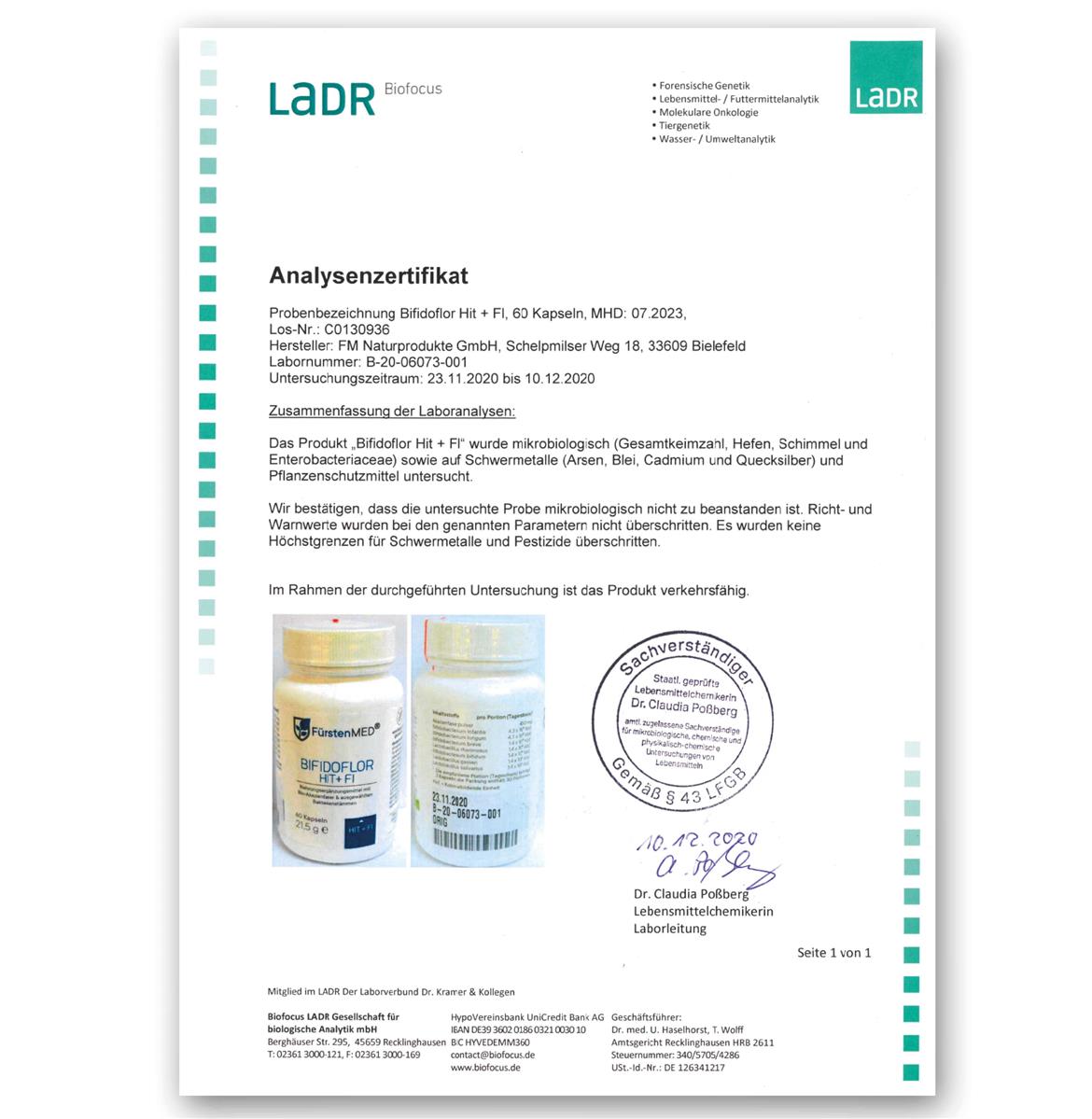 Die FürstenMED® Bifidoflor HIT + FI Kapseln stammen aus deutscher ISO- und HACCP-zertifizierter Produktion unter strenger Einhaltung höchster Qualitätsstandards. Der bewusste Verzicht auf unnötige Zusatzstoffe wie Magnesiumstearat (Magnesiumsalz der Speisefettsäuren) oder Titandioxid sorgt für eine verbesserte Bioverfügbarkeit.